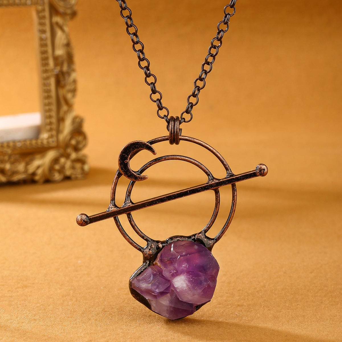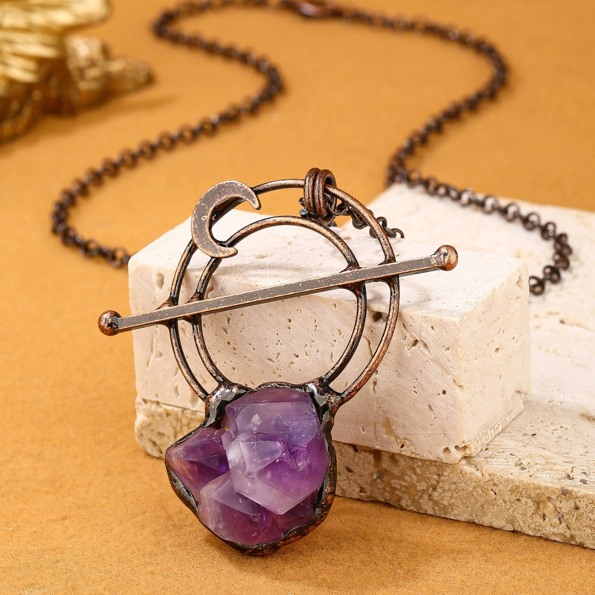 Vintage Style Natural Amethyst Buds Raw Stone Hand Solder Plated Bronze Pendant Necklace