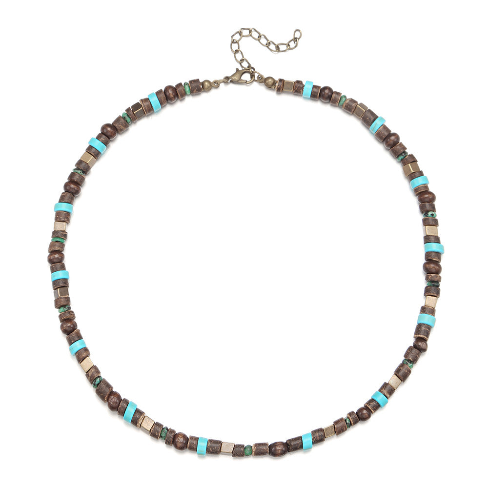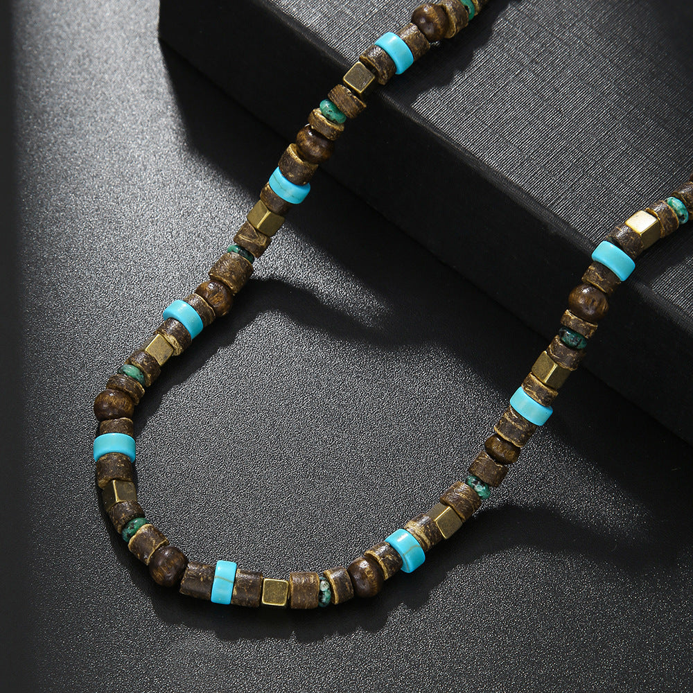 Turquoise Metal and Wood Bead Patchwork Necklace
